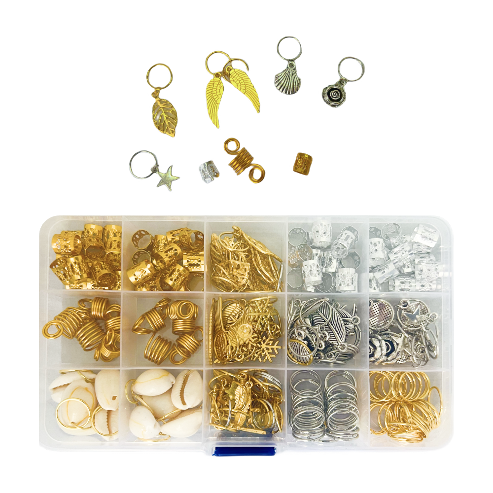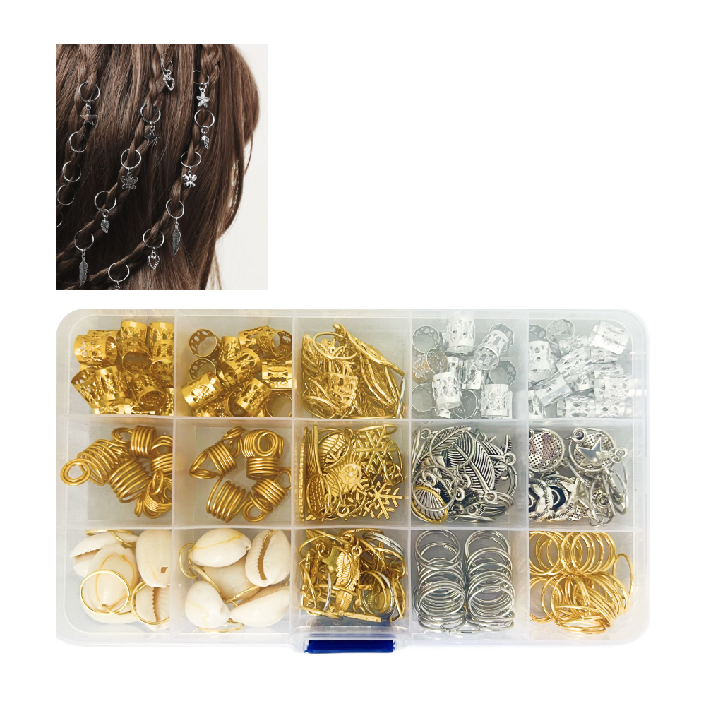 Неймовірно стильні сучасні прикраси для волосся. Вони прикрасять колосочки або ж звичайні косички. Створюй свої неперевершені образи. В наборі аж 220 різних елементів: кілечки сріблястого та золотистого кольору, кілечки із мушлями, зірочками, листочками та іншими елментами, також бочечки та пружинки. Зручна коробка-ораганйзер, де можна зберігати всі прикраси.