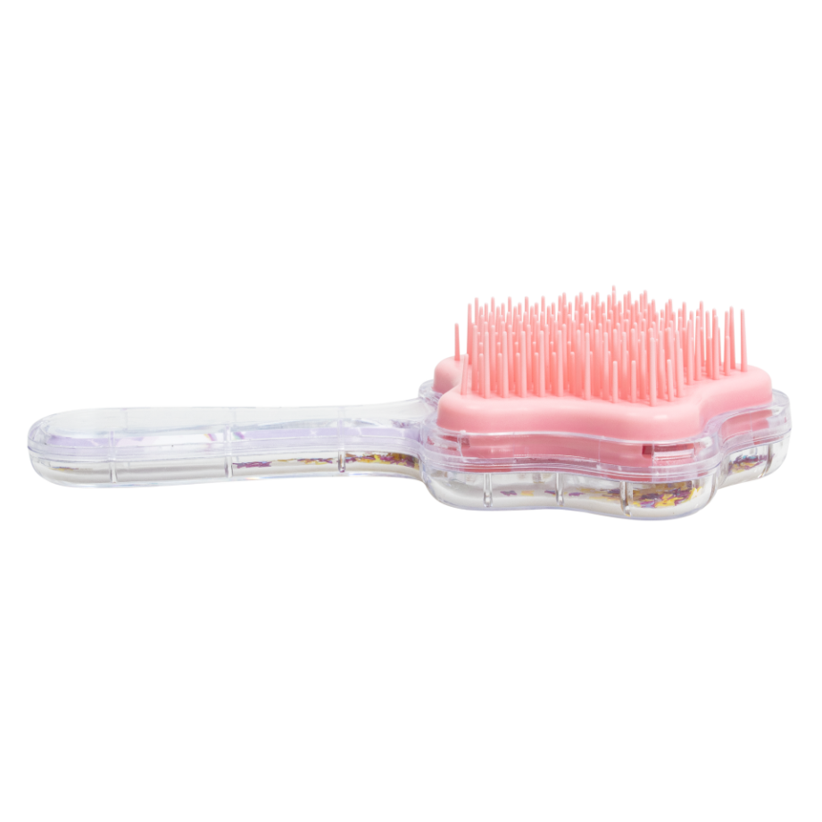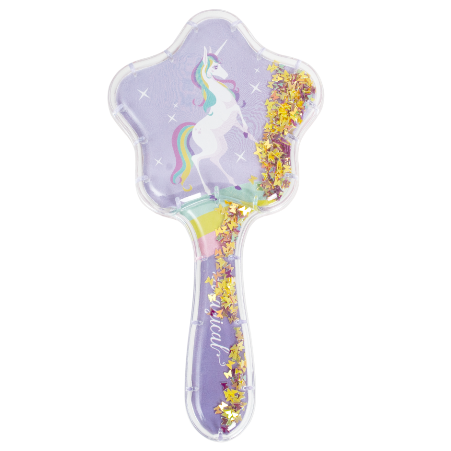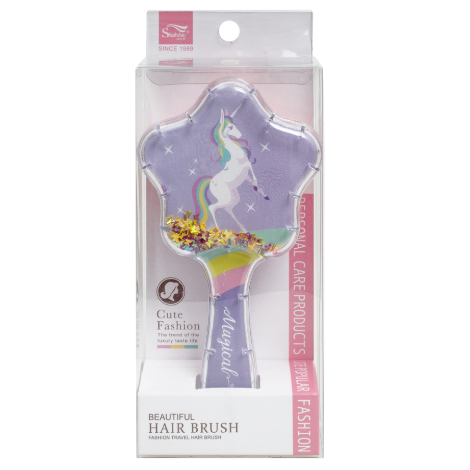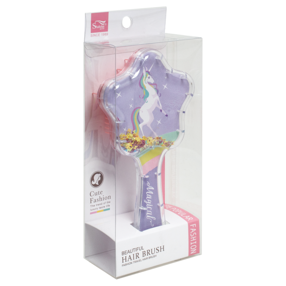Дитячий гребінець для волосся з блискітками всередині. Особливістю гребінця є його дизайн – наявність блискіток у прозорому корпусі. При нахилі гребінця, блискітки починають також переміщатися, красиво розсипаючись. Розмір гребінця без упаковки – 18*8*4,5 см. Розмір індивідуального пакування складає 8,5*4,7*22 см. Тематика – єдиноріг.