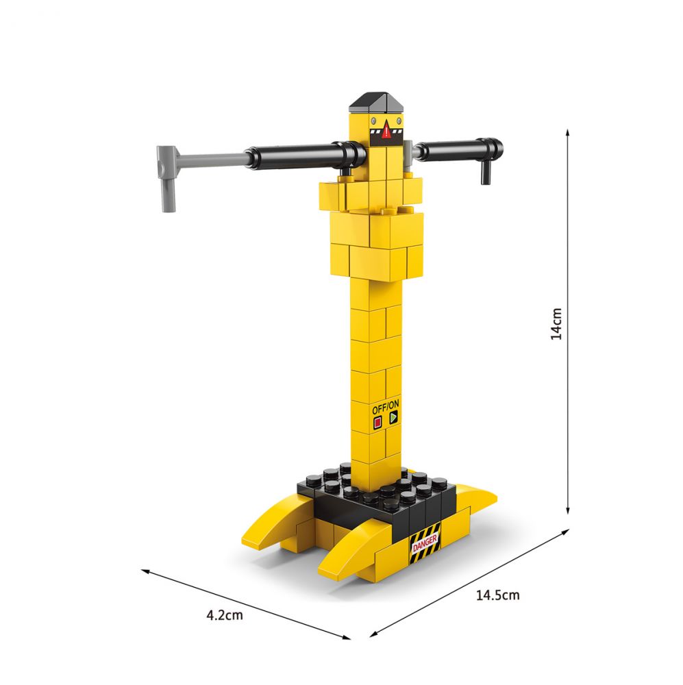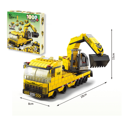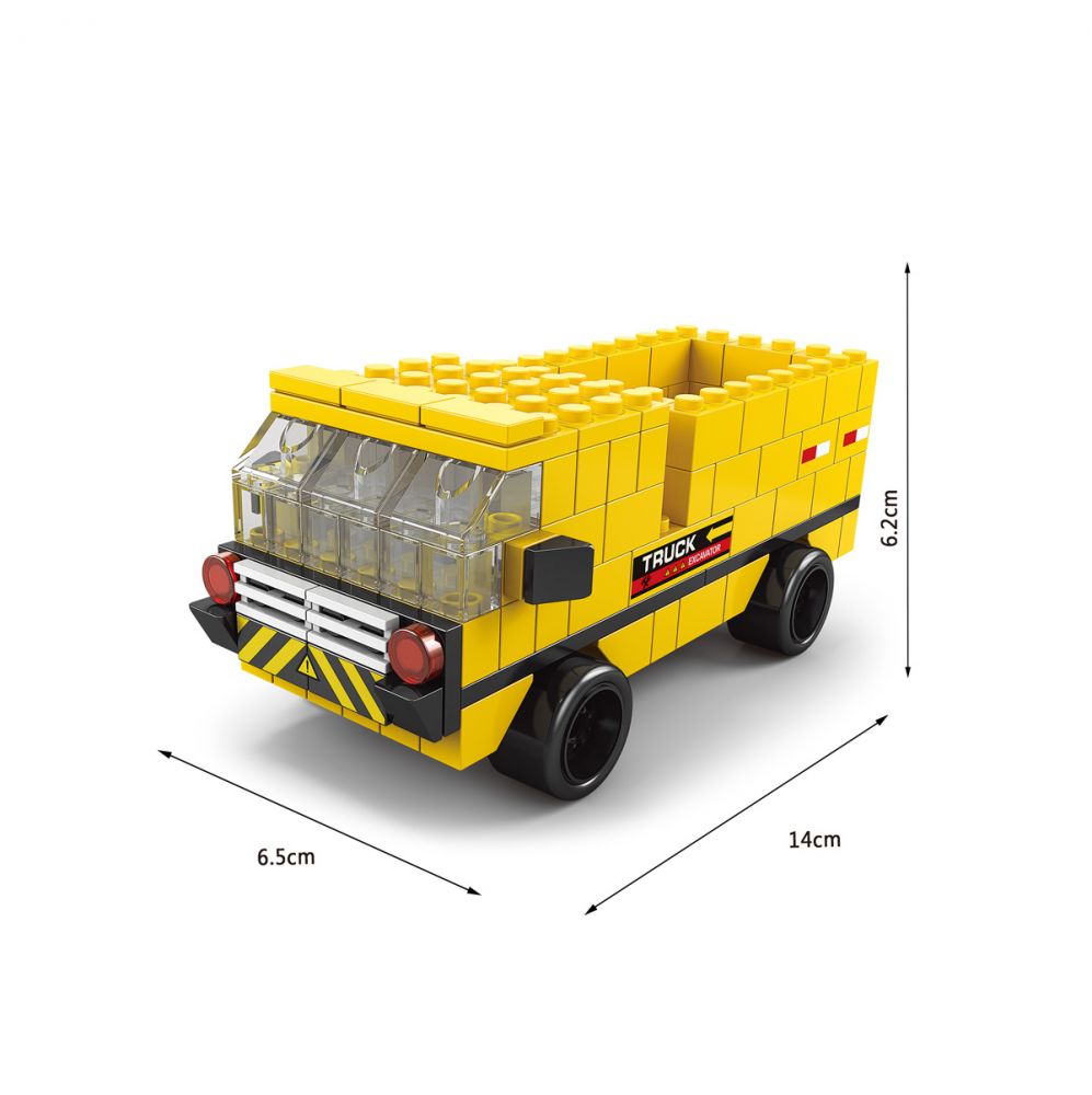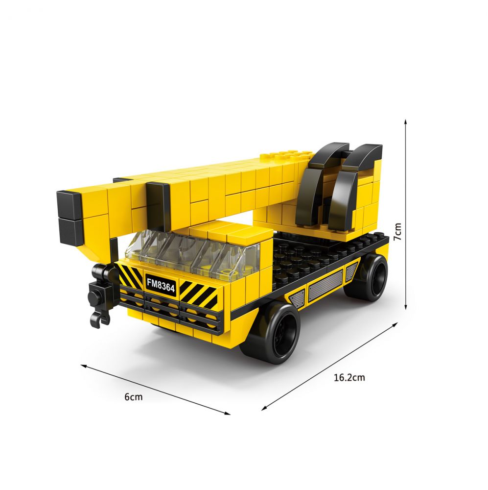 З 1000 деталей можна зібрати 6 окремих елементів: підйомний кран, навантажувач, самоскид, екскаватор, машину-кран, трактор. Всі елементи об'єднуються у великий виріб -будівельну автівку. Конструктор легосумісний, у кожній упаковці є інструкція – детальна, кольорова, наклейки для оздоблення готових виробів, деталі, посортовані в пакети. Елементи конструктора вироблені з пластику. Конструювання розвиває дрібну моторику та допомагає тренувати координацію рухів.