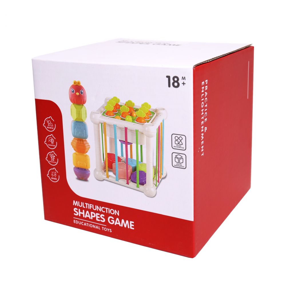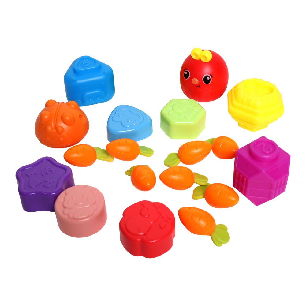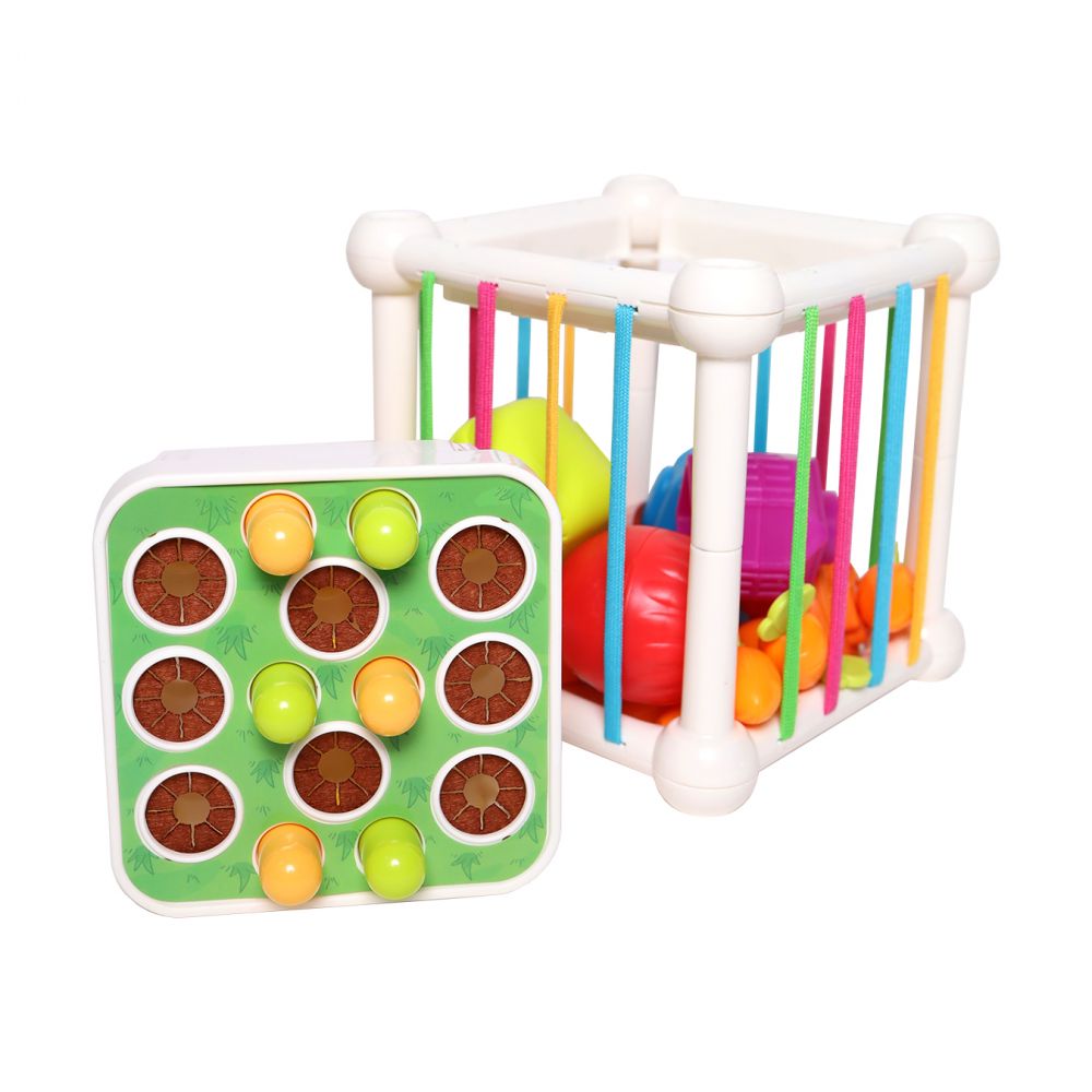 Мультифункціональний розвиваючий куб. Це розвиваюча іграшка для малюків за методикою Монтесорі. Чотири грані куба оснащено різнокольоровими шнурами. Одна з граней куба є стандартним сортером з отворами для 5-ти геометричних фігур. Дитині належить закинути усередину всі іграшки - 11 пластикових фігур із різною текстурною поверхнею. При цьому фігурки, що підходять для сортера, закидаються через одну грань, а інші - в проміжки між гнучкими поясками. Фігурки можна між собою з'єднувати. Одна з граней є "городом", де вирощують моркву. У складі 8 мокрвин із пластику та отвори - "грядки" для саджання морквин. Також до складу входит спінер. Кути куба виконані із нейлону, всередині -гума.