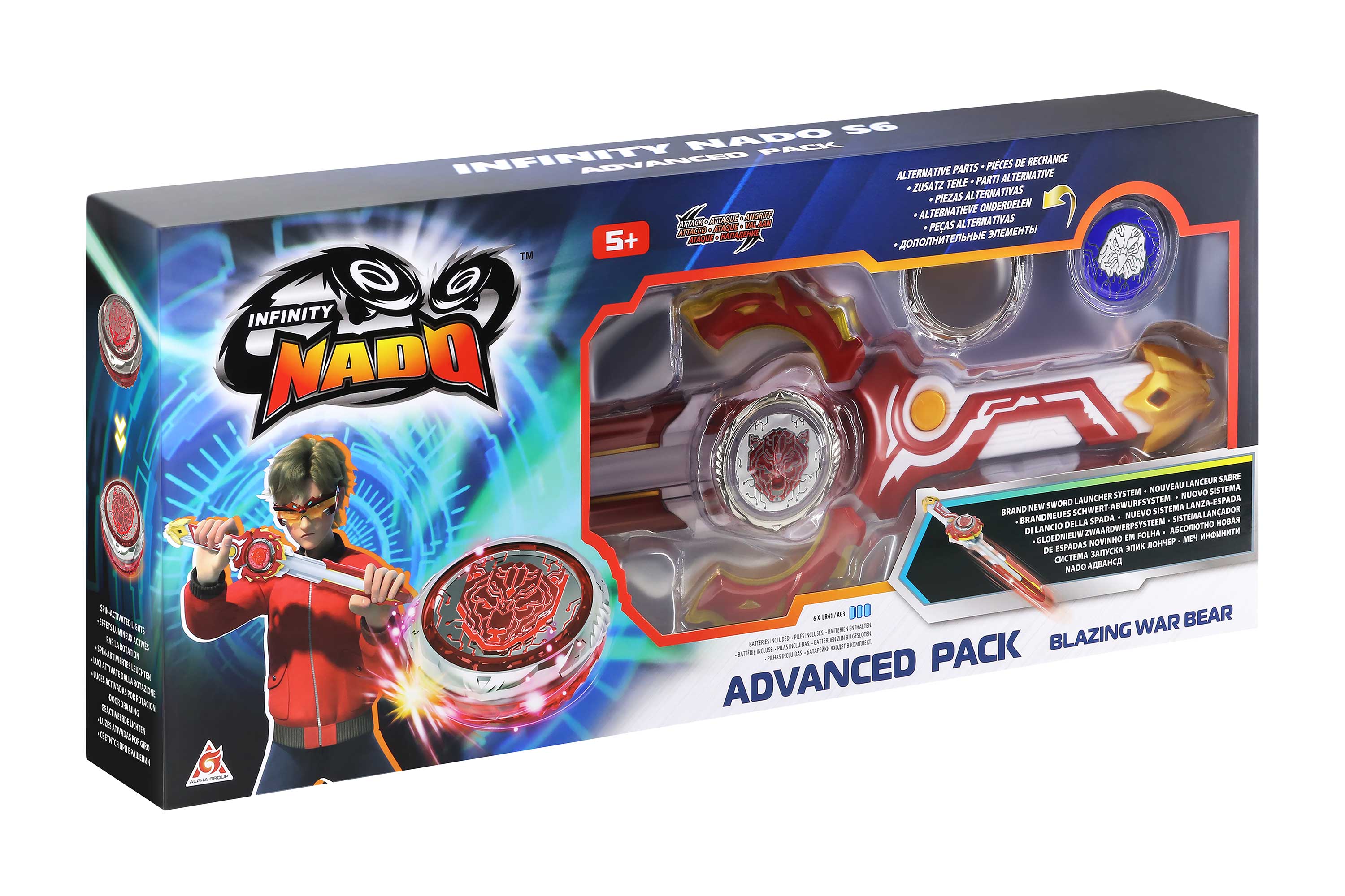Infinity Nado VI серії Advanced Pack – дзиґа нового 6 покоління зазнала значних вдосконалень, що беззаперечно подарують нові емоції від ще більш видовищних та цікавих поєдинків. Абсолютно нова система запуску дзиґи на арену реалізована за допомогою епічного лаунчера у вигляді меча, що має більший розмір і вдосконалений зовнішній вигляд, пускова система покликана забезпечить контрольований швидкісний запуск.