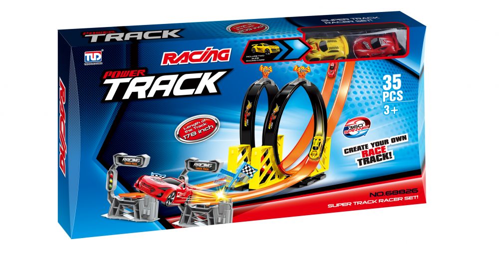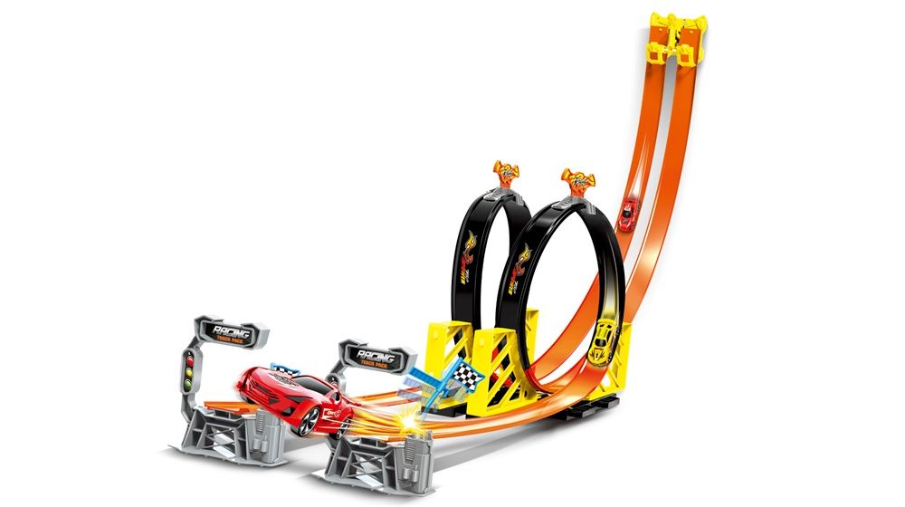 Цей набір подарує масу задоволення своєму юному власнику за рахунок безмежних варіантів комплектації і збільшення колії. У комплект входить не тільки траса дорожня, але і такі аксесуари, як дві петлі, їзда по яких машина обертається на 360 градусів, від чого йде обертом голова! Елементи доріжки мають безліч варіантів конфігурації, що дозволяє нескінченно збільшувати масштаб треку за допомогою сумісних пресетів.