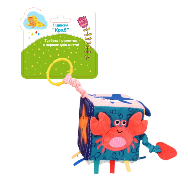 Весела та розвиваюча іграшка у формі куба в образі краба. Її легко кріпити до візочка, автокрісла або ліжечка, що робить її ідеальною для будь-якої прогулянки або подорожі. На кожній з шести граней куба зображені різні морські мешканці: кит, морські зірки, скат та інші. Кожен малюнок сприяє розвитку зорового сприйняття та уяви.