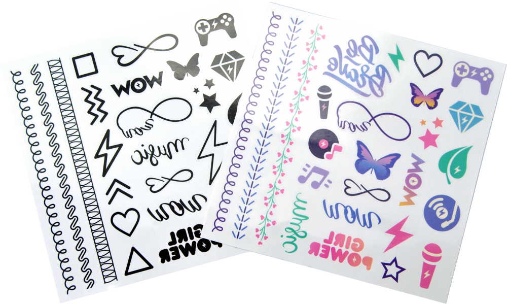 2 аркуші з татуюваннями (кольорові + чорні).