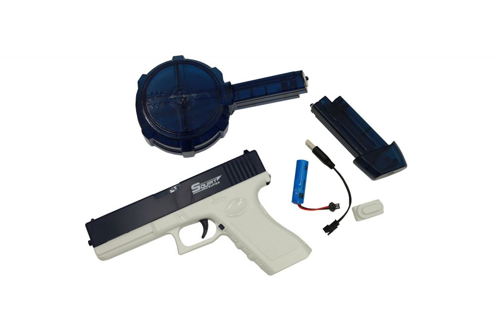 Водний пістолет електричний акумуляторний з двома резервуарами. Має інтенсивний потік води, дальність 7 метрів! Постріл робиться одним натисканням кнопки. У комплект входять пістолет, 2 варіанти резервуарів для води – 480 мл та 50 мл, акумулятор, USB, викрутка, інструкція. Під час гри можна швидко змінити резервуари, якщо вода в одному з них закінчилася. Прозорий дизайн дозволяє чітко бачити кількість води у резервуарі. Корпус виготовлений із високоякісного ABS-пластику, що дозволяє йому витримувати інтенсивні водні бої. Батарея забезпечує до 30 хвилин автономної роботи. Час заряджання батареї – 2 години. Заряджання: USB Акумулятор: 500 mAh 3,7 V Розмір пістолета: 22*17*3 см УВАГА: Пістолет не призначений для опускання під воду, це призведе до виходу його з ладу! Колір - синій з білим.