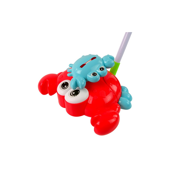 Дитяча каталка в образі морського грайливого краба. Іграшка виконана у яскравих привабливих кольорах. Коли каталка починає рух, маленький крабік, який знаходиться на спинці у великого, починає рухатись та видавати звук дзвіночка. Іграшка має ручку, яка складається та розкладається. Розмір краба: 20 х 18 х 13 см. Довжина ручки: 43 см. Пакування: сітка з холдером.