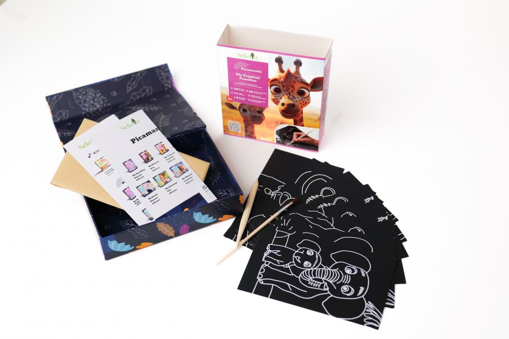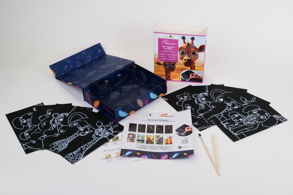 Дитина працює дерев’яною паличкою, акуратно знімаючи верхній шар і відкриваючи кольорову основу. У процесі поступово з’являються милі персонажі з тропічного світу — жирафи, слони та інші тварини у сімейних сюжетах.