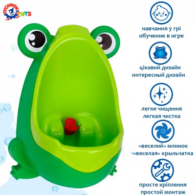 Веселий дизайн "жабка" та цікаві наліпки "очі" неодмінно привернуть увагу дитини до пісуару.