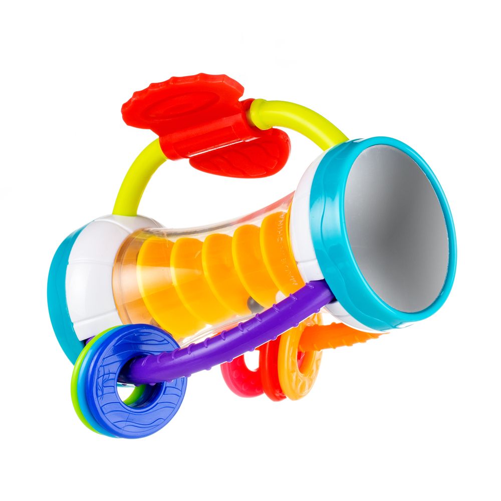 Брязкальце виконане у формі спіралі з двома зручними ручками з рельєфною поверхнею. Усередині спіралі знаходяться кульки, які видають характерний для брязкальця шум, який благотворно впливатиме на розвиток слухового сприйняття малюка. Яскраві кольори стимулюють допитливість та запам'ятовування, а рельєфні ручки розвивають тактильні відчуття. З боків іграшки є безпечне дзеркальце, дивлячись у яке малюк навчиться усвідомлювати себе.