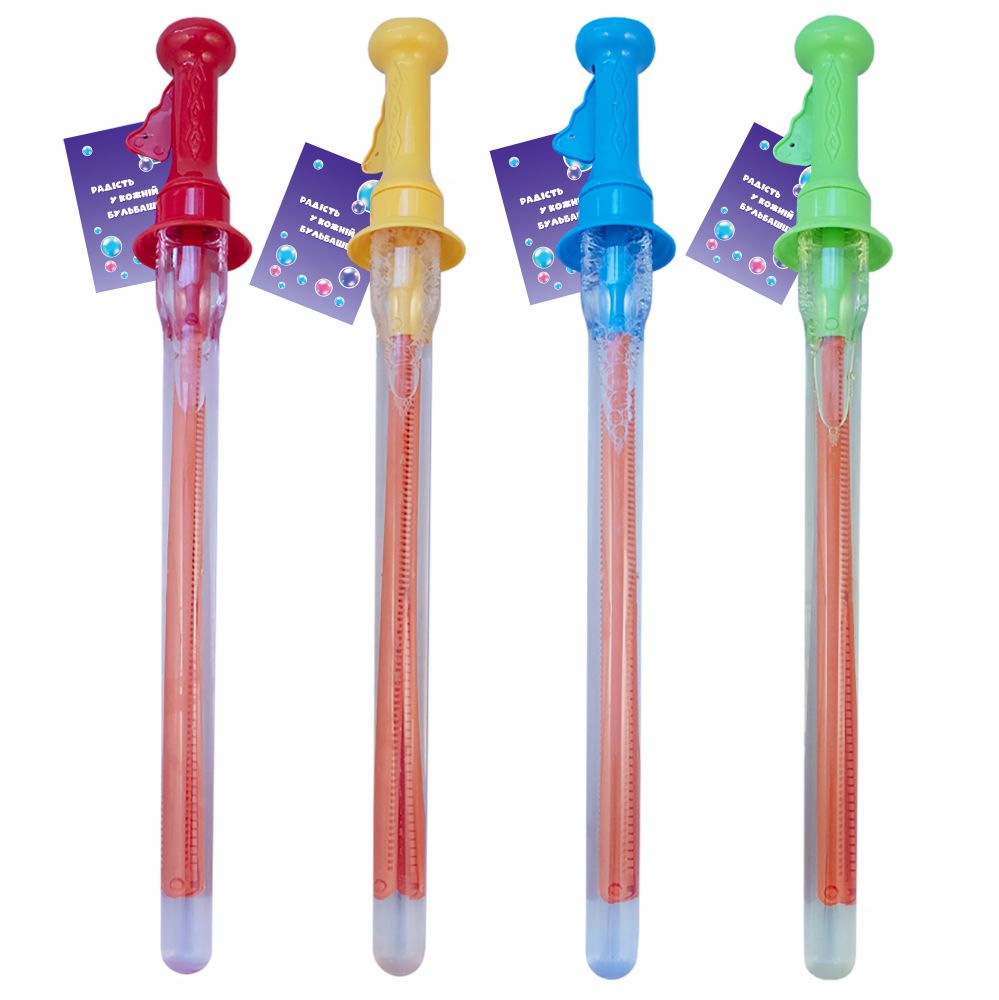 Іграшка у вигляді меча. Трикутник для видування бульбашок розкривається за допомогою важелю на ручці. Розкривай і видувай гігантські різнокольорові бульбашки! Розмір меча - 40см, у флаконі- 85мл розчину. Рекомендуємо гратися на вулиці, щоб уникнути протікання розчину на підлогу та предмети інтер''єру.