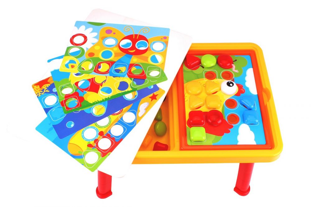 Ігрове поле Мозаїки зручно розмістити в одній із ніш столика, а трафарети та фішки в іншій. Так діткам буде цікаво гратися мозаїкою, адже всі елементи будуть завжди під рукою.