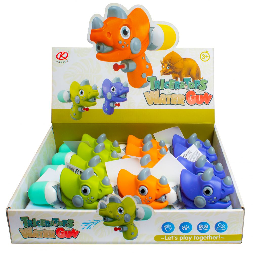 Міні-водний пістолет у вигляді динозаврика розміром 15 * 4 * 12 см. У ємність поміщається 14 мл води. Стріляє коротким струменем води. Для того щоб наповнити ємність водою, її необхідно відкрутити від корпусу пістолета. .Розмір корпусу зброї складає 11*4*12см, пляшки – 4,5*4*4 см. Постачання здійснюється в дисплеї по 12 шт. Розмір дисплея становить 37*12*34 см.
