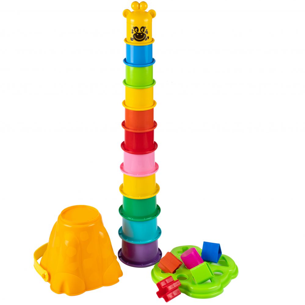 Розвиваюча іграшка-сортер "Жирафік"- це необмежені можливості для комплексного розвитку вашого малюка! Ігровий набір являє собою зручне відерце з ручкою і отворами для різних фігурок, фігурки різних кольорів, а також 11 стаканчиків різного діаметру, з яких можна побудувати високу пірамідку у формі жирафа висотою 75 см або складати стаканчики один в одного. Крім цього, зі стаканчиками можна грати як у пісочниці, так і у ванній. На основі кожного стаканчика є об'ємні геометричні елементи. Іграшка розвиває моторику ручок та пальчиків, координацію рухів, уяву, логіку та багато іншого. Матеріал: поліпропілен. Індивідуальна упаковка: сітка + холдер.