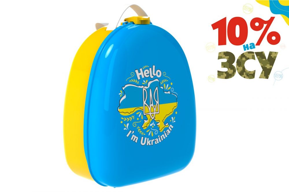 Рюкзаки з патріотичною наліпкою "Hello, I'm Ukrainian", в двох кольорових варіантах: хакі та синьо-жовтий.