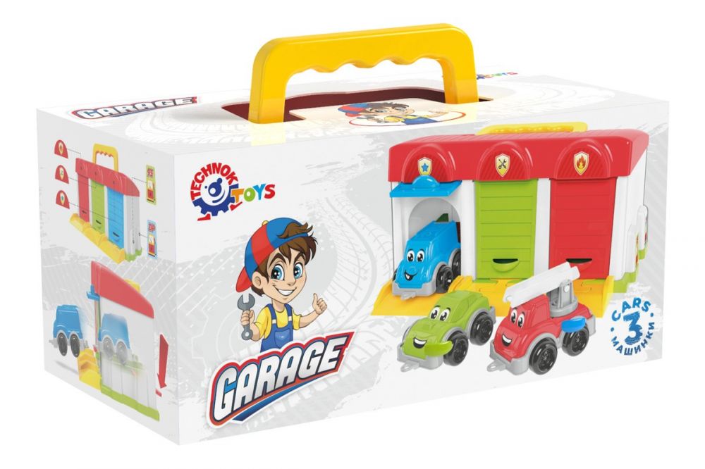 У гаражі 3 бокси з тематичними наліпками над воротами та відповідним кольором дверей: поліційна дільниця, СТО, пожежна станція. У кожному боксі спеціалізований автомобіль: великий блакитний мікроавтобус, швидкісний салатовий спорткар та потужна червона пожежна машина з рухомою драбиною. Переносити гараж на інше місце зручно за ручку на даху.
