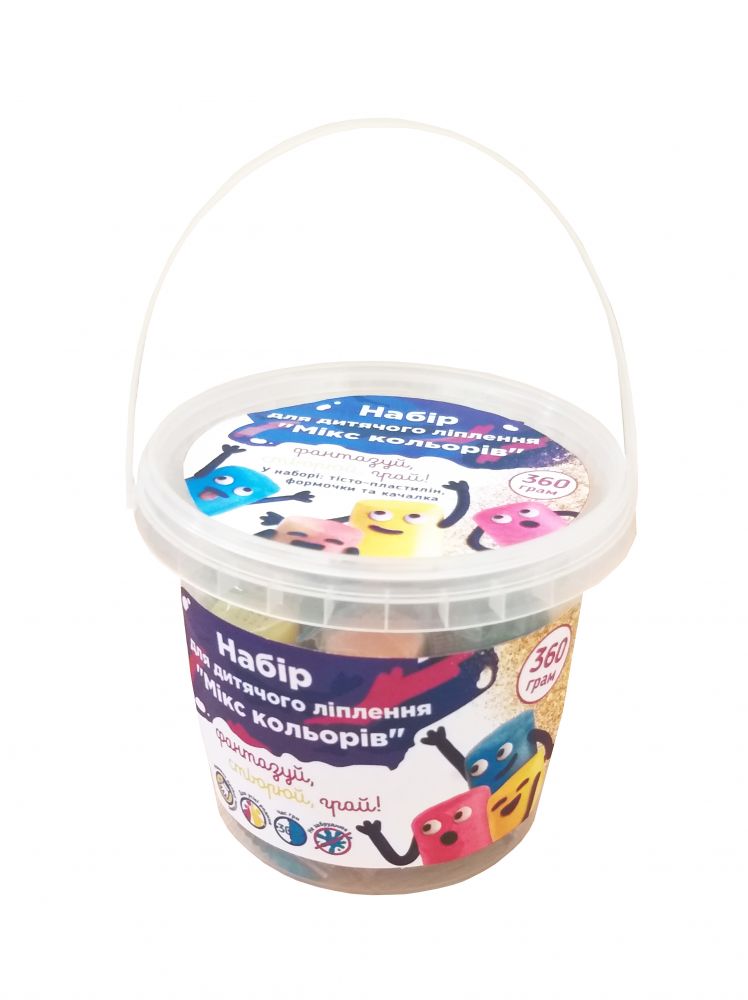 Набір тіста-пластиліну для ліплення в контейнері. Для дітей від 3-х років і старше. Склад тіста-пластиліну: борошно, вода, крохмаль, сіль, ароматизатор, барвник. Склад набору: тісто-пластилін різних кольорів - 12 шт. по 30 гр кожний.